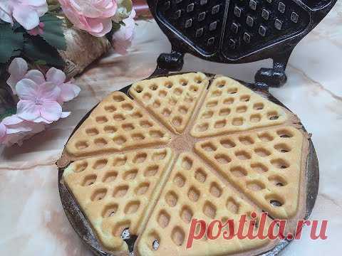 На изображении видны свежие вафли, которые только что были приготовлены в вафельнице. Вафельница имеет традиционную круглую форму и раскрыта, чтобы показать готовую вафлю с характерной решетчатой текстурой. На заднем плане видны искусственные цветы, придающие сцене уют.