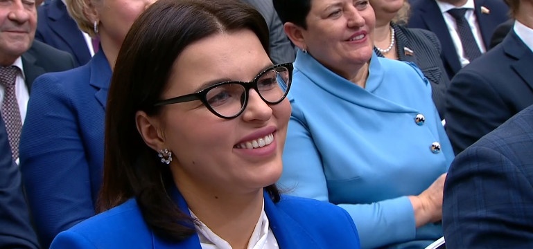 На изображении женщина в синем пиджаке с улыбкой, в очках, в окружении других людей. В верхнем правом углу изображения надпись на русском языке.