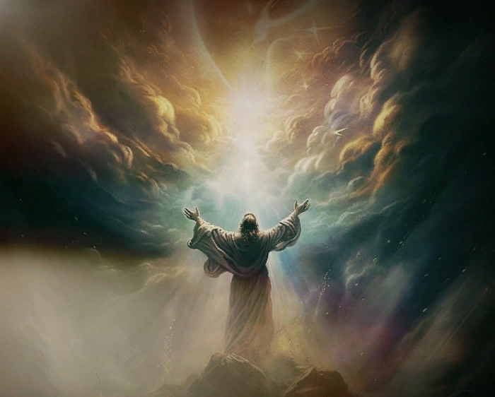 На изображении представлен персонаж, стоящий с поднятыми вверх руками перед ярким светом, исходящим сверху, который пронизывает облака. Атмосфера сцены напоминает религиозную или духовную иллюстрацию.