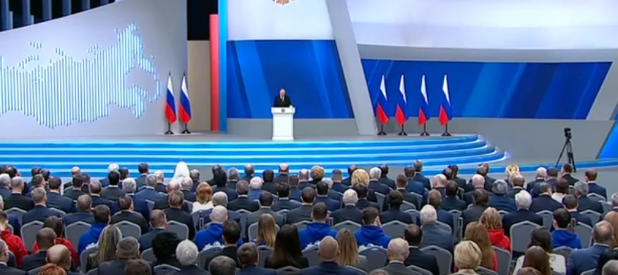 На фотографии изображено официальное мероприятие или конференция. Человек на трибуне выступает перед аудиторией, состоящей из многочисленных слушателей. Зал украшен флагами, а на заднем плане видны графические элементы и символика.