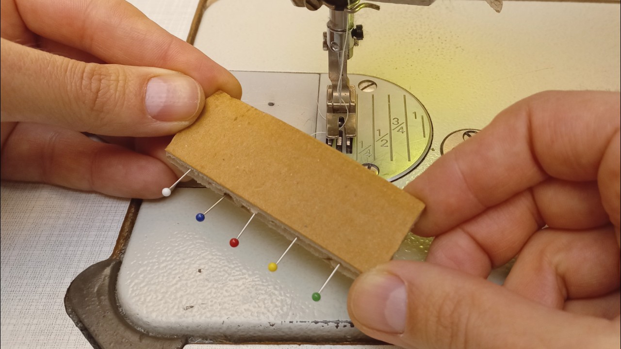 На изображении видна рука человека, которая держит кусок картона с прикрепленными к нему цветными булавками. В фоне размыто видна швейная машина.