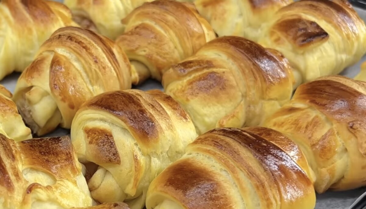 На изображении видно несколько хорошо зарумяненных слоеных изделий, по всей видимости, это круассаны. Они выглядят аппетитно и золотисто, что указывает на то, что они хорошо выпечены.