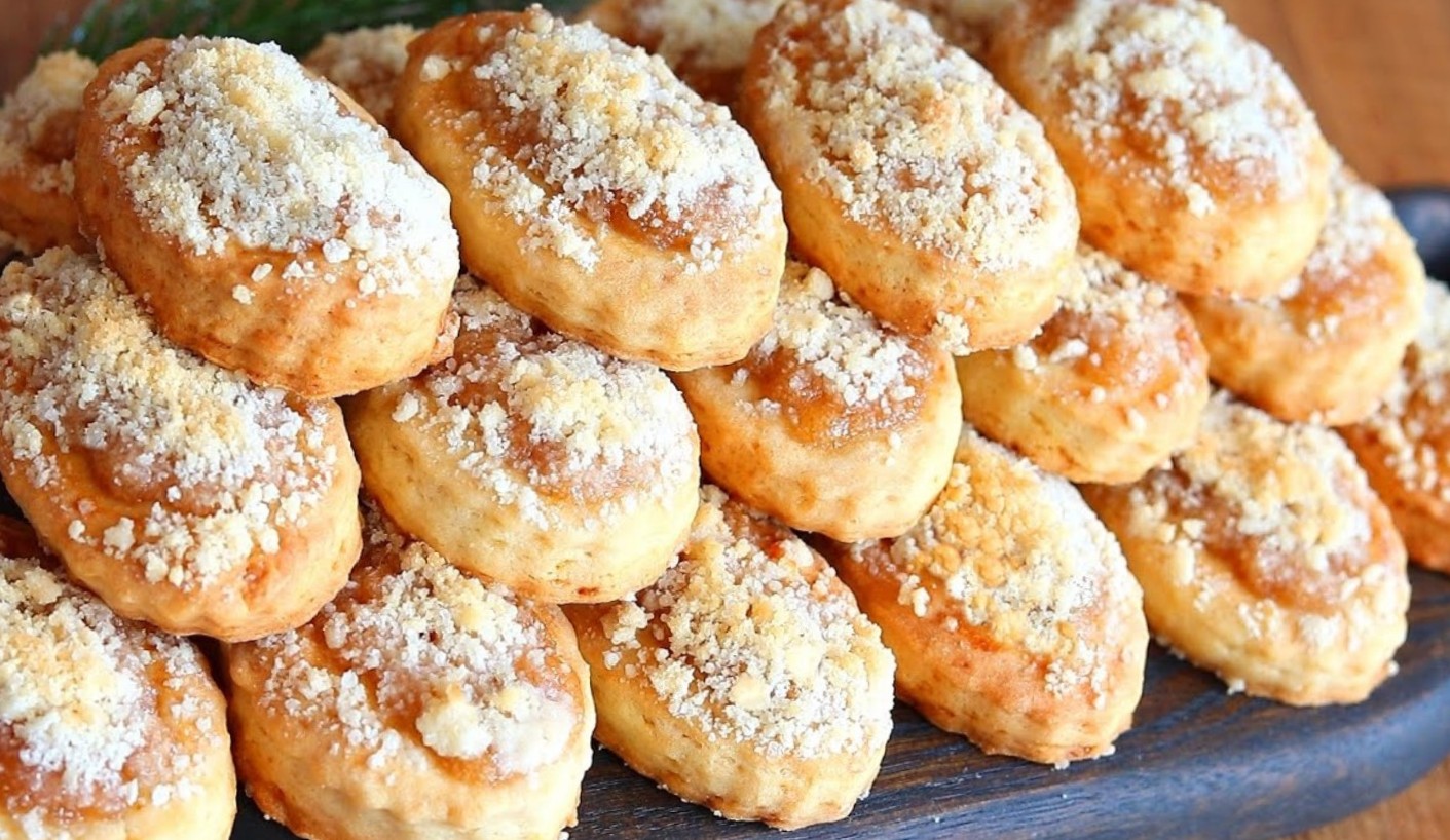 На изображении видны слоеные печенья, присыпанные крошками, возможно, орехами или сахарной пудрой. Печенья аккуратно уложены на поднос или тарелку.