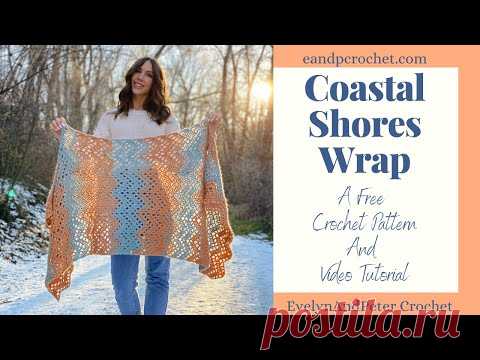 Женщина держит в руках вязаный шарф и улыбается. Название вязаного изделия "Coastal Shores Wrap" указано на изображении, где также указано, что есть бесплатный узор для вязания и видеоурок.