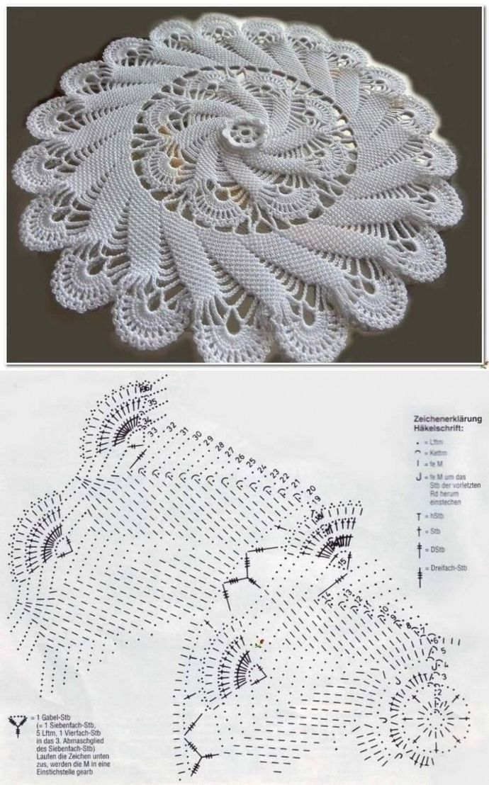 На изображении представлена белая вязаная кружевная салфетка сверху и схема для вязания крючком под ней. Салфетка имеет сложный узор с переплетением рядов и розеток. Схема включает в себя различные обозначения для петель и элементов вязания с пояснениями на немецком языке.