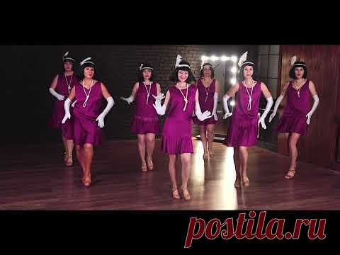 Группа женщин в пурпурных платьях и темных перчатках выступает с танцем в стиле 1920-х годов в помещении с деревянным полом.