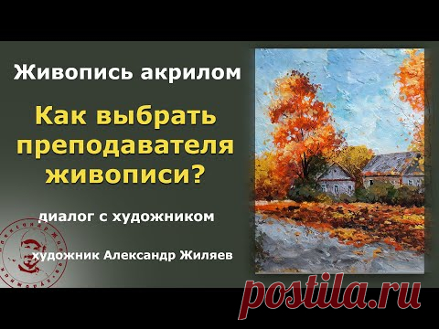На изображении присутствует текст на русском языке, который говорит о живописи акрилом и задает вопрос о том, как выбрать преподавателя живописи. Слева текст, справа изображение осеннего пейзажа с деревьями и домами.