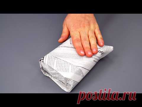 На изображении рука человека давит на пакет с воздухом, который, похоже, сделан из оберточной бумаги или газеты. Пакет предназначен для использования как упаковочный материал для защиты предметов во время транспортировки.