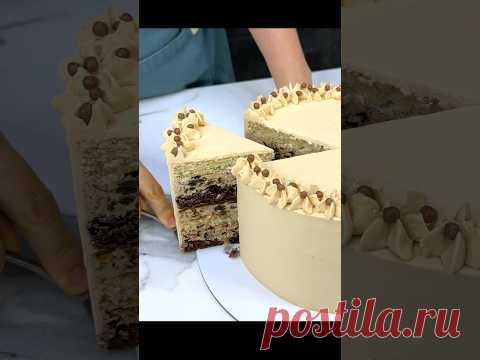 На изображении показан торт, который аккуратно разрезается на порции. Торт кремового цвета с насыпанной крошкой и декором в виде кофейных зерен на верхушке. Его структура видна на разрезе, показывая ярусы теста и крема.
