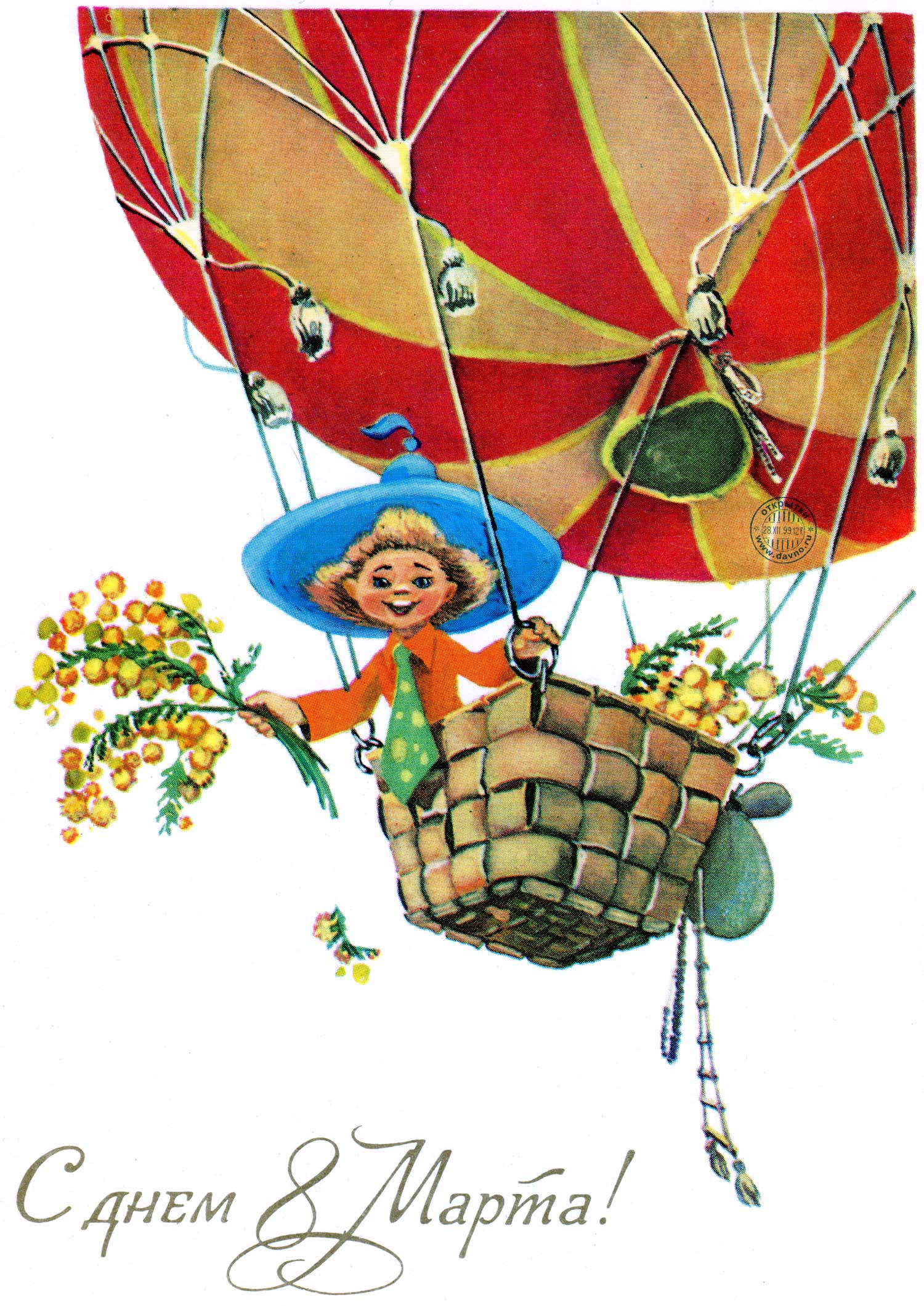 На изображении карточка с поздравлением ко Дню 8 Марта. На ней изображена девочка в широкополой шляпе и оранжевом платье, которая летит на воздушном шаре. Воздушный шар красный с желтыми и зелеными полосами, а девочка держит ветку с цветами в руке. Она улыбается и кажется счастливой.