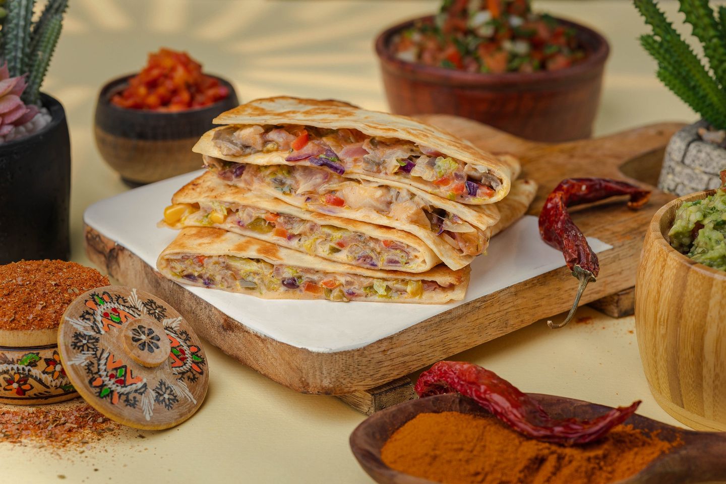 На изображении представлены кесадилья — мексиканское блюдо, состоящее из лепешки с сыром и другой начинкой. Поданы на деревянной доске, рядом различные приправы и соусы.