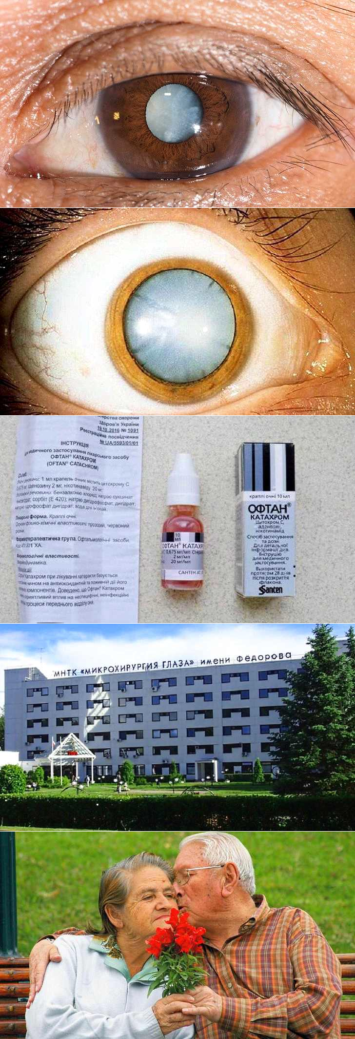 Коллаж изображений связанных с глазами и зрением. Верхнее изображение показывает крупный план человеческого глаза. Второе изображение - это глаз с катарактой. Третье изображение демонстрирует медицинские препараты для лечения глазных заболеваний. Нижние два изображения включают здание клиники глазной хирургии и пару пожилых людей, демонстрирующих нежные чувства друг к другу.