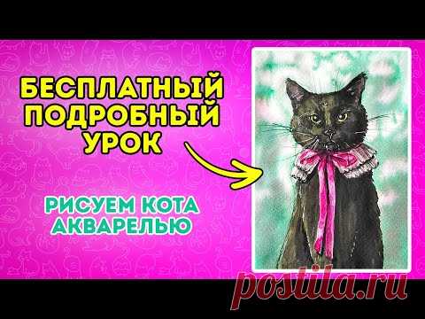Картинка с текстом на фоне, предлагающая бесплатный подробный урок по рисованию кота акварелью. Изображение кота с шарфом нарисовано на зеленоватом фоне.