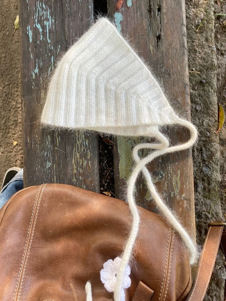 Белая вязаная шапочка на деревянной скамейке рядом с кожаной сумкой.