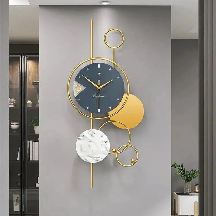 Современные настенные часы в геометрическом стиле с золотым и черным дизайном на серой стене