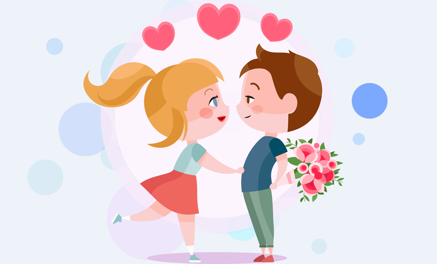 Картинка мультяшных персонажей: мальчик вручает девочке букет цветов, окруженные сердечками, на фоне надписи "postila.ru".