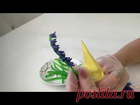 На изображении видны руки человека в перчатках, которые держат желтый конусообразный предмет, похожий на рожок мороженого. На столе также есть синие цветы и зеленые предметы, которые напоминают зелень или листья.