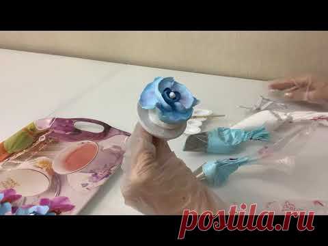 На столе изображены человеческая рука, украшенная голубым цветком, предметы для мастерства, такие как бумага и кисти для рисования. Видно, что кто-то занимается творчеством или рукоделием.