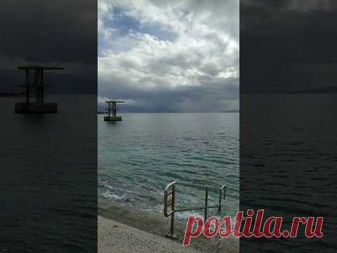 На изображении видны две вышки для прыжков в воду, расположенные в море. Небо облачное, предвещающее возможный дождь, а вода кажется спокойной. На переднем плане видна береговая линия с небольшой металлической оградой.