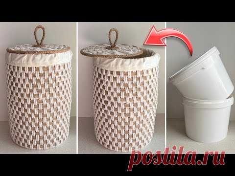 Преобразованный пластиковый ведро в декоративный корзину с крышкой.