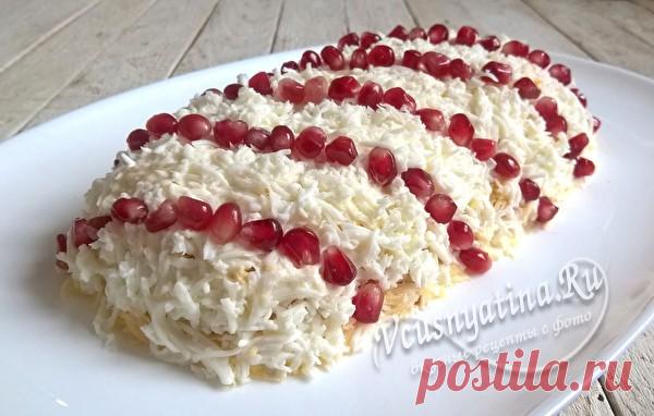 На белой тарелке находится салат, украшенный зернами граната, который придает ему праздничный вид. Салат выложен в форме овала и похож на популярный русский салат "Гранатовый браслет", который часто подают на праздничный стол.