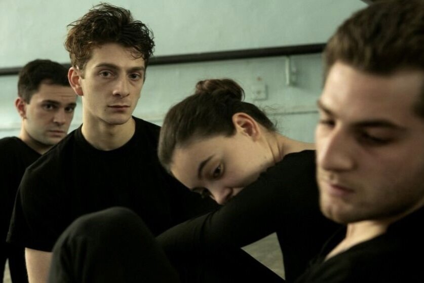 На изображении четверо молодых людей, скорее всего, находящиеся в студии или классе. Один мужчина выглядит прямо в камеру, в то время как остальные кажутся поглощенными своими мыслями или задачами. Обстановка и экспрессии лиц выражают серьезную атмосферу.