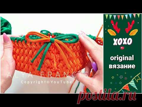 На изображении показан процесс вязания яркой оранжевой вещи с использованием крючка. Вязаное изделие украшено зелеными и красными шнурками, связанными в узел. В правой части картинки присутствует текст с упоминанием Али Францис, означающее, что это, возможно, название автора или бренда. Также видны логотипы и слоганы "XOXO" и "original вязание".