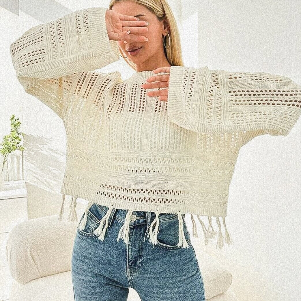 Женщина в белом вязаном свитере и джинсах стоит в комнате, прикрывая лицо руками