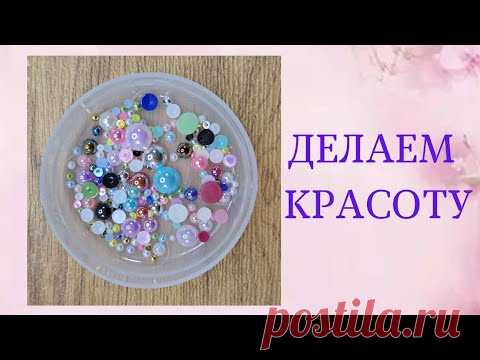 На изображении представлен пластиковый контейнер с разноцветными бусинами и пайетками, расположенный на деревянной поверхности. Текст на картинке гласит: "ДЕЛАЕМ КРАСОТУ posilka.ru", указывая на тематику рукоделия или украшений.