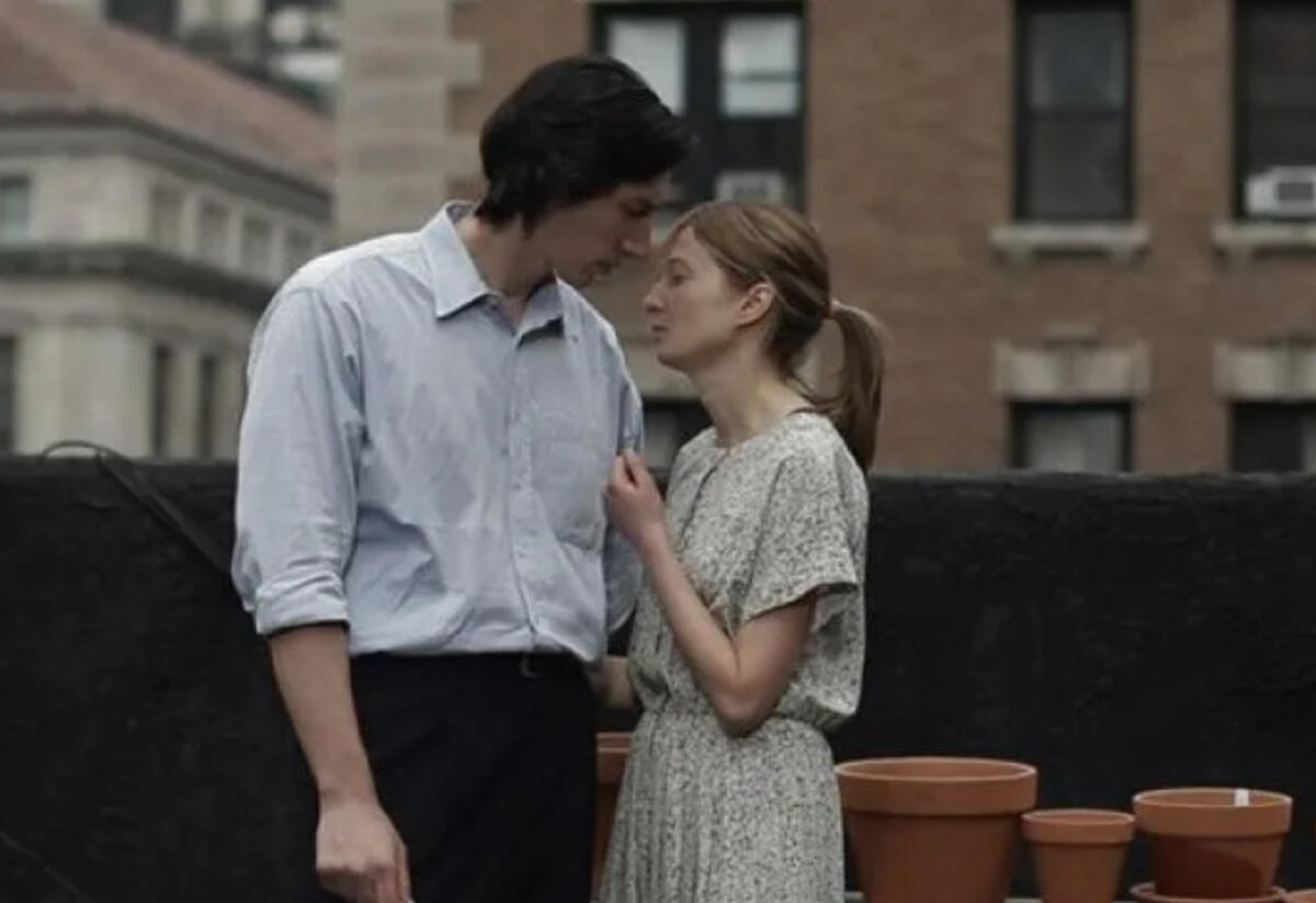 На изображении молодая пара стоит лицом друг к другу на фоне зданий. Они выглядят как будто они обмениваются нежными чувствами или вступают в личный разговор. Мужчина касается женщины по плечу, они оба не улыбаются, но их выражения лиц кажутся мягкими и серьезными.