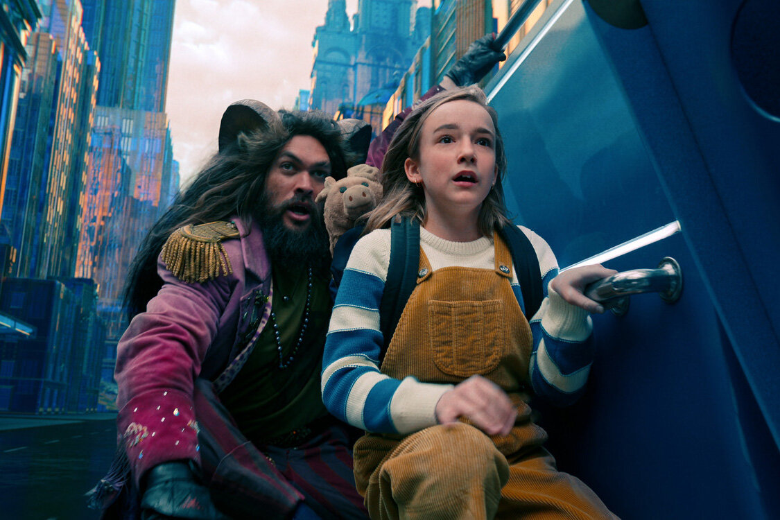 На изображении видны два персонажа из кинофильма: мужчина и девочка. Они кажутся сфокусированными на чем-то вне кадра и находятся в динамичном положении, словно они в движении или в состоянии действия. Мужчина одет в яркую одежду с деталями, которые могут предполагать, что он относится к фантастическому или историческому персонажу. Девочка одета в повседневную одежду. Окружение наполнено футуристическими или магическими элементами, такими как необычные здания и яркие цвета.