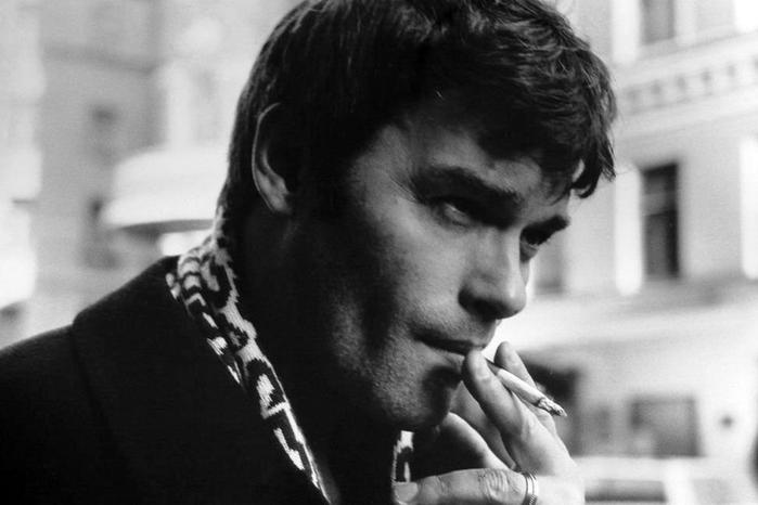 Черно-белое изображение мужчины, курящего сигарету на улице. Он кажется задумчивым или сосредоточенным, и на нем надета темная одежда и светлый шарф с узором.