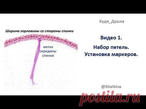 На изображении представлен скриншот видеоурока по вязанию. Показан элемент вязания крючком розового цвета с отметкой середины спинки и указанием ширины горловины со стороны спинки. Также есть текстовые пояснения на русском языке, дающие понять, что это первое видео из серии, посвящённое набору петель и установке маркеров.