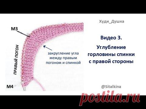 На изображении представлена схема вязания, где демонстрируется процесс создания выступа в вязаной детали, возможно горловины одежды. Видно небольшое вязаное полотно розового цвета с обозначениями этапов работы.