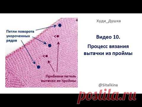 На изображении представлена схема вязания вытачки из проймы, включающая в себя обозначения для петель и направления вязания. Изображение предположительно взято из обучающего материала или руководства по вязанию.
