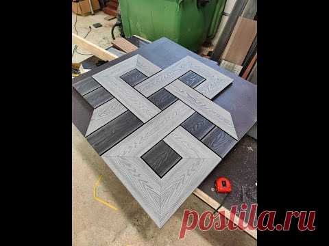 На изображении представлена деревянная панель с геометрическим узором на рабочем столе. Панель окрашена в черный и серый цвета, создавая контрастный и современный вид. Видно, что работа возможно еще не завершена, так как в углу стола лежит красная рулетка.