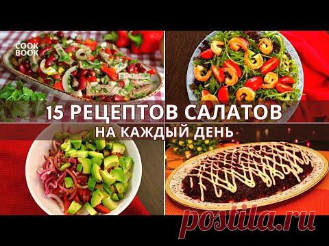 Изображение с текстом "15 РЕЦЕПТОВ САЛАТОВ НА КАЖДЫЙ ДЕНЬ", представляющее рекламу кулинарной книги или видео с рецептами салатов. На картинке изображены четыре разных салата, которые выглядят аппетитно и подходят для ежедневного употребления.