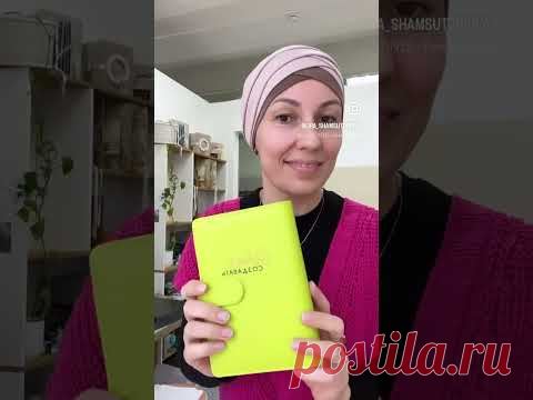 Женщина в головном уборе улыбается и держит в руке желтый блокнот. На фоне видна комната с мебелью и предметами интерьера.