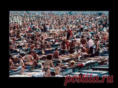 Большое количество людей загорают на шезлонгах в людном публичном месте, возможно на пляже или в парке. Окружающая обстановка указывает на отдых и летнее время.