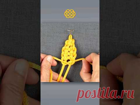 На изображении показан процесс создания макраме узлов. Руки человека ведут работу с жёлтым шнуром, создавая декоративный узор. Фон нейтральный, серый.