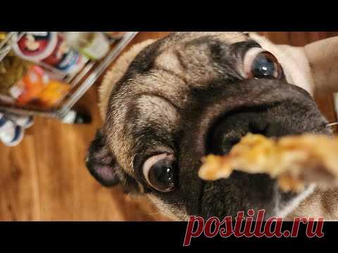 Мопс смотрит на камеру, перед ним что-то съестное. На заднем плане размыт интерьер комнаты.