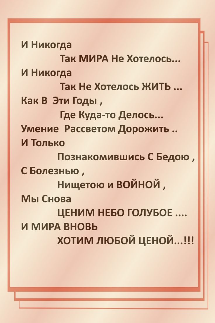Изображение с текстом на русском языке, содержащим рефлексивные строки о жизни, мире и ценности моментов после трудностей. Оформление включает в себя бежевый фон с оранжевым и розовым узором на границах.