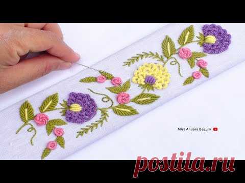 На изображении показан процесс вышивки. Чья-то рука держит иглу и проводит нить через ткань, на которой вышит цветочный узор. Узор состоит из желтых, фиолетовых и розовых цветов, а также зеленых листьев и стеблей.