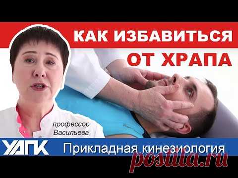 На изображении видны два человека, женщина и мужчина. Женщина, предположительно врач или специалист по кинезиологии, делает некоторые манипуляции с лицом мужчины, который лежит на спине. Вверху надпись "КАК ИЗБАВИТЬСЯ ОТ ХРАПА". Справа внизу написано "профессор Васильева" и слова "Прикладная кинезиология rostiha.ru". Представляется, что это кадр из обучающего видео или рекламы медицинской процедуры.