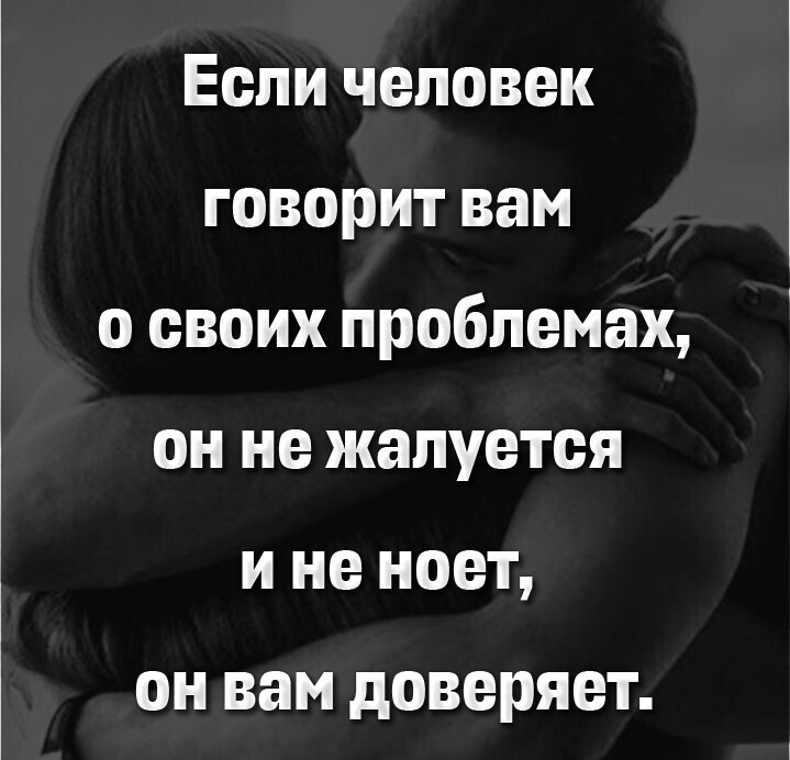 На изображении представлены два человека, обнимающиеся. Надпись на русском языке гласит: "Если человек говорит вам о своих проблемах, он не жалуется и не ноет, он вам доверяет". Это изображение имеет видимость мема или мотивационного постера, призванного подчеркнуть значение доверия и честного общения между людьми.