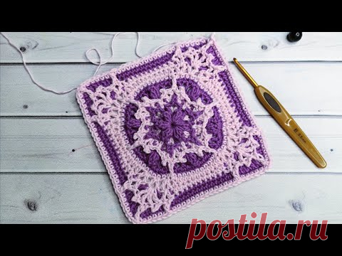 На изображении представлено рукоделие: квадратная вязаная крючком плитка с узорами в лиловых и фиолетовых оттенках. Рядом лежит крючок для вязания.
