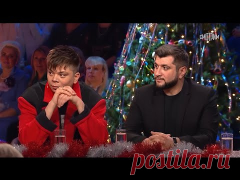 На изображении видны два человека: мальчик и мужчина, сидящие за столом на фоне новогодней елки и праздничного декора. Они кажутся участниками телевизионной передачи, так как виден логотип телеканала в углу изображения.