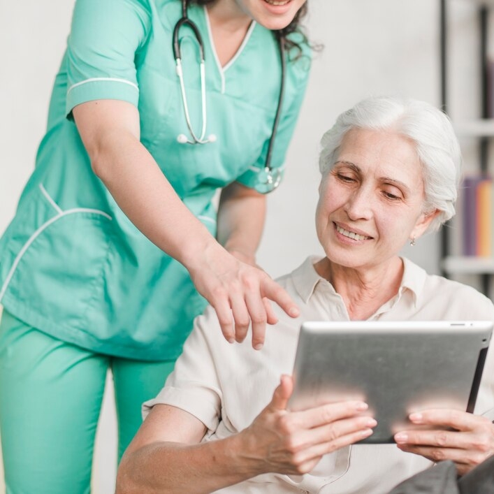 Медицинский работник в зеленой униформе показывает что-то пожилой женщине с серыми волосами на планшете. Они обе улыбаются и кажется, что они счастливы и довольны тем, что видят на экране. Они находятся в светлом помещении, что предполагает медицинскую обстановку.