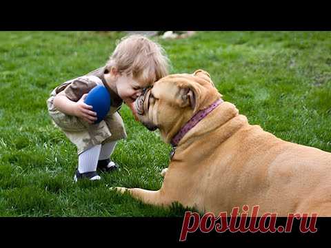 маленький ребенок встал на корточки на зеленой траве лицом к коричневой собаке породы мопс, которая кажется дружелюбной; они находятся на улице, и ребенок держит синий мяч