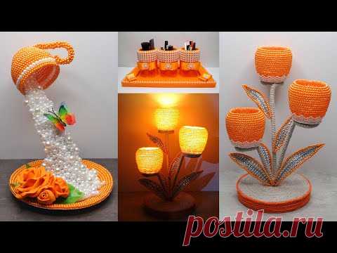 Коллаж из трех различных предметов интерьера, выполненных в оранжевых тонах. На первом изображении - необычная лампа с эффектом падающих бус, на втором - органайзер для косметики или письменных принадлежностей с подсветкой, на третьем - декоративные светильники в виде цветов.